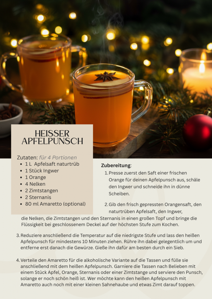 Der Duft von Apfel, Zimt und winterlichen Gewürzen erfüllt das Zuhause im Handumdrehen und sorgt für eine Extraportion Wohlfühlstimmung. Ob nach einem Spaziergang, auf dem Weihnachtsmarkt oder einfach gemütlich auf dem Sofa – dieser Punsch macht die Adventszeit noch ein bisschen schöner.