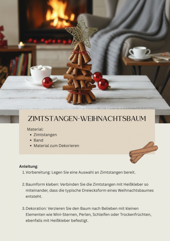 Stellt euch vor, wie kleine Weihnachtsbäume aus Zimtstangen euer Zuhause schmücken: Sie sehen nicht nur bezaubernd aus, sondern verbreiten gleichzeitig diesen warmen, weihnachtlichen Duft, der sofort für Wohlfühlstimmung sorgt.