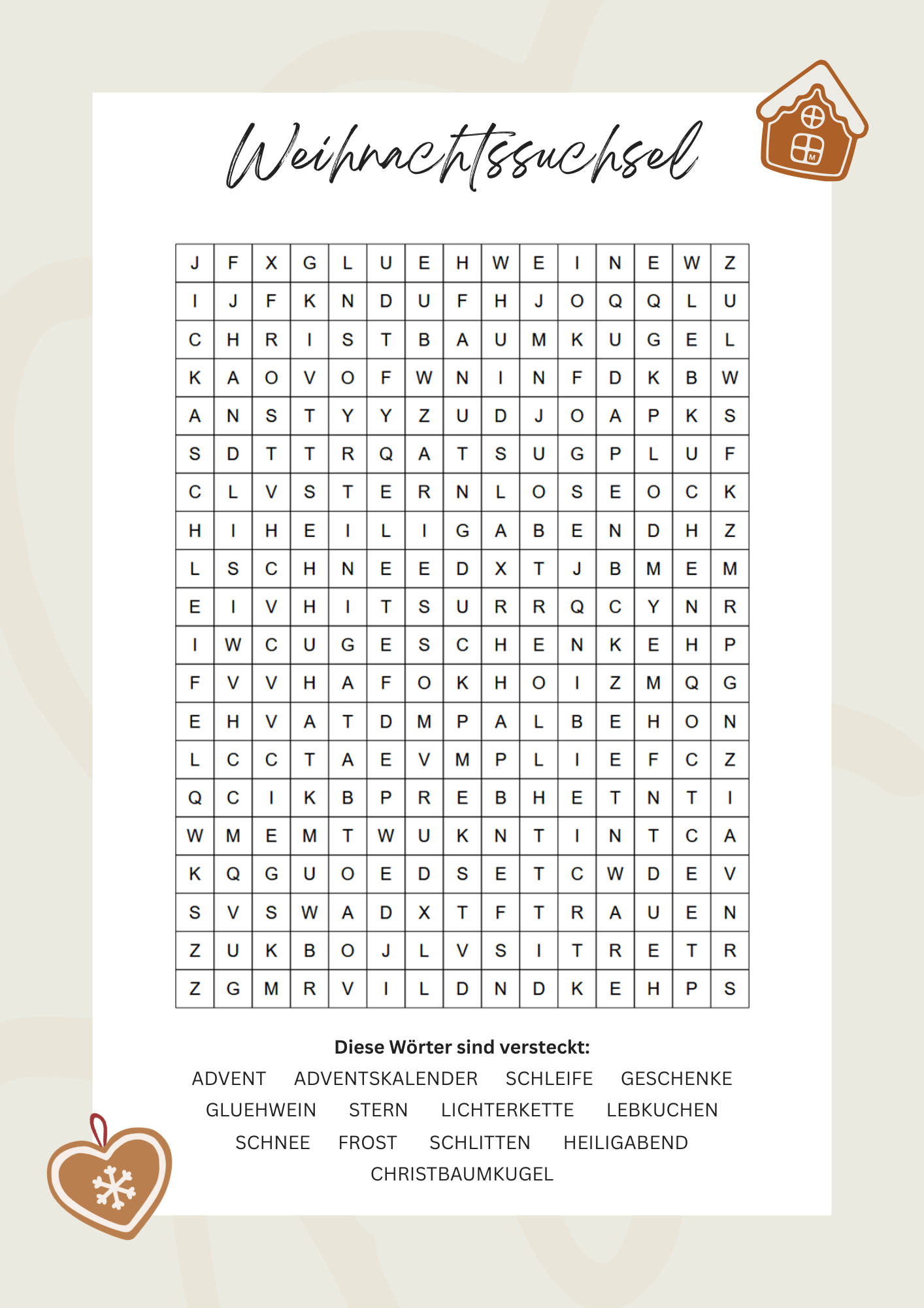 Zwischen vielen Buchstaben haben sich typische Weihnachtswörter versteckt. Ob waagerecht, senkrecht oder diagonal – findet sie alle und testet eure Konzentration. Das Suchsel ist eine schöne kleine Auszeit vom Alltag und eignet sich perfekt für eine ruhige Minute in der Adventszeit.