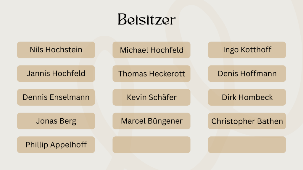 Ebenfalls Teil des erweiterten Vorstands sind die Beisitzer. Sie haben keine fest zugewiesenen Aufgaben, unterstützen den Vorstand jedoch flexibel und tatkräftig bei Arbeitseinsätzen, Vorbereitungen und Veranstaltungen. Ihr Einsatz ist ein wichtiger Baustein für ein funktionierendes und lebendiges Vereinsleben.