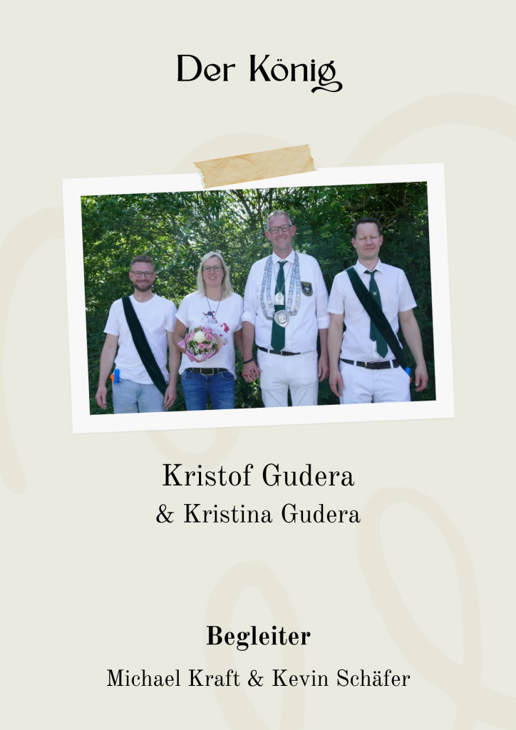 Natürlich gehören auch der König mit seinen Begleitern, der Vizekönig mit seinen Begleitern sowie der Kaiser zum Vorstand unserer Bruderschaft. Sie repräsentieren unsere Traditionen nach außen, begleiten festliche Anlässe und tragen wesentlich zum Erscheinungsbild und zur Würde unserer Veranstaltungen bei.