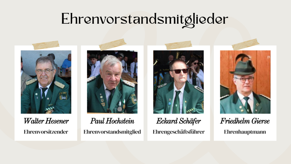 Zuletzt gehören auch die Ehrenvorstandsmitglieder zum erweiterten Vorstand. Sie bringen ihre langjährige Erfahrung, ihr Wissen und ihre Verbundenheit zur Bruderschaft ein und stehen dem Vorstand beratend zur Seite. Durch ihre Unterstützung tragen sie dazu bei, dass Traditionen bewahrt und die Bruderschaft weiterhin stark und lebendig bleibt.
