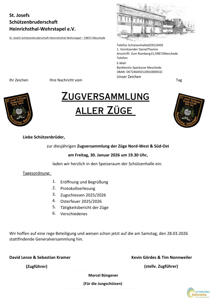 Neben den Berichten der Zugführer möchten wir gemeinsam auf die nächsten Highlights im Vereinskalender blicken. Nutzt die Gelegenheit, eure Fragen zu stellen und aktiv am Vereinsleben teilzunehmen.